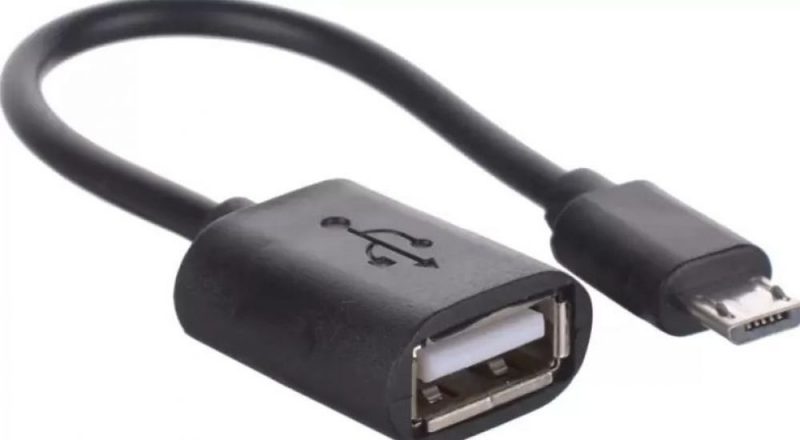 Foto de un USB-OTG. Una parte va hacia el puerto del teléfono y en la otra se coloca el conector del mouse.
