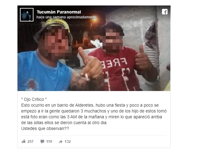 “Esto ocurrió en un barrio de Alderetes, hubo una fiesta y poco a poco se empezó a ir la gente quedaron 3 muchachos y uno de los hijos de estos tomó está foto eran como las 3 AM de la mañana y miren lo que apareció arriba de las sillas ellos se dieron cuenta al otro dia. Ustedes que observan??”, escribieron en el posteo junto a la imagen que ya dio la vuelta al mundo.