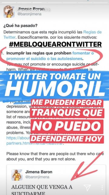 Al parecer no fue del agrado de Twitter que le bloqueo su cuenta, adjudicando que incumplió la regla que prohíbe fomentar o promover el suicidio o las autolesiones.