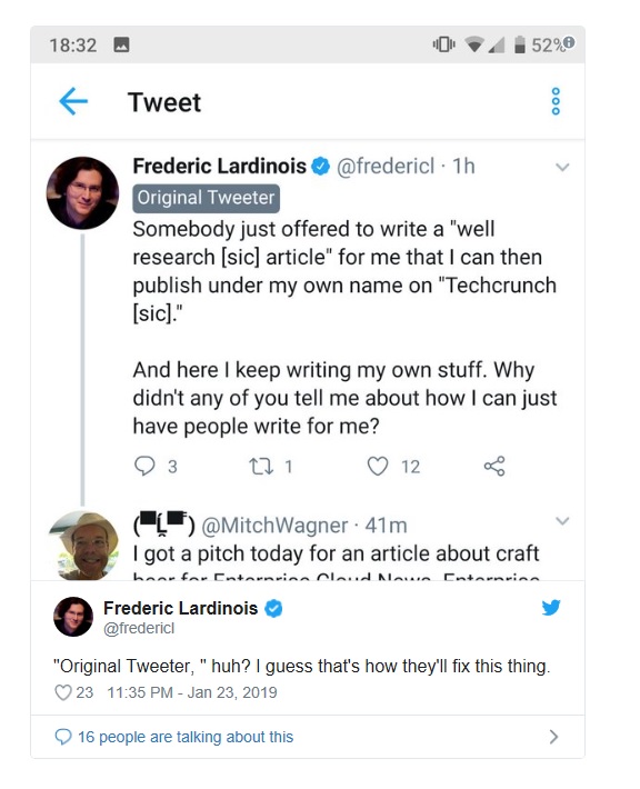 Ya circula una beta de Twitter con funciones que organizan las conversaciones largas. Según un reporte del sitio TechCrunch, la red social del pájaro azul prueba una etiqueta que muestra al tuitero que inició un hilo de tuits, tal como podés ver a continuación.