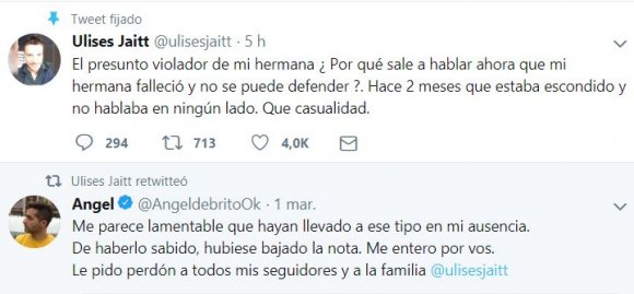 Dolido y molesto por el accionar del cineasta, Ulises Jaitt le dedicó un fuerte tweet: “El presunto violador de mi hermana ¿por qué sale a hablar ahora que mi hermana falleció y no se puede defender? Hace 2 meses que estaba escondido y no hablaba en ningún lado. Qué casualidad“, expresó, indignado.