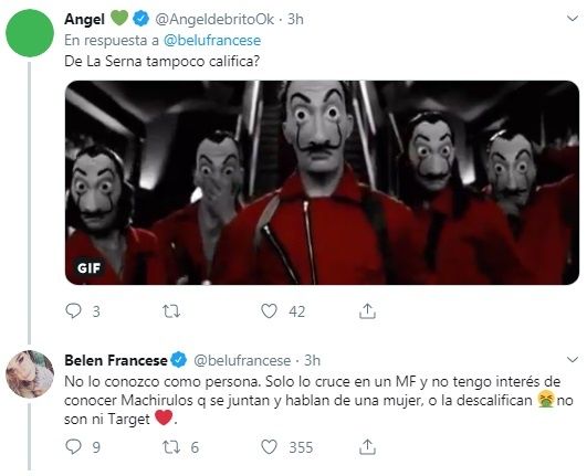 Sobre De la Serna, respondió: “No lo conozco como persona. Solo lo crucé en un Martín Fierro y no tengo interés de conocer machirulos que se juntan y hablan de una mujer, o la descalifican. No son mi target”.