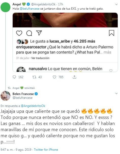 Horas más tarde, Ángel De Brito realizó capturas del comentario y le escribió a la vedette: “Hola @belufrancese se juntaron dos de tus ex y uno te trató de gato”.