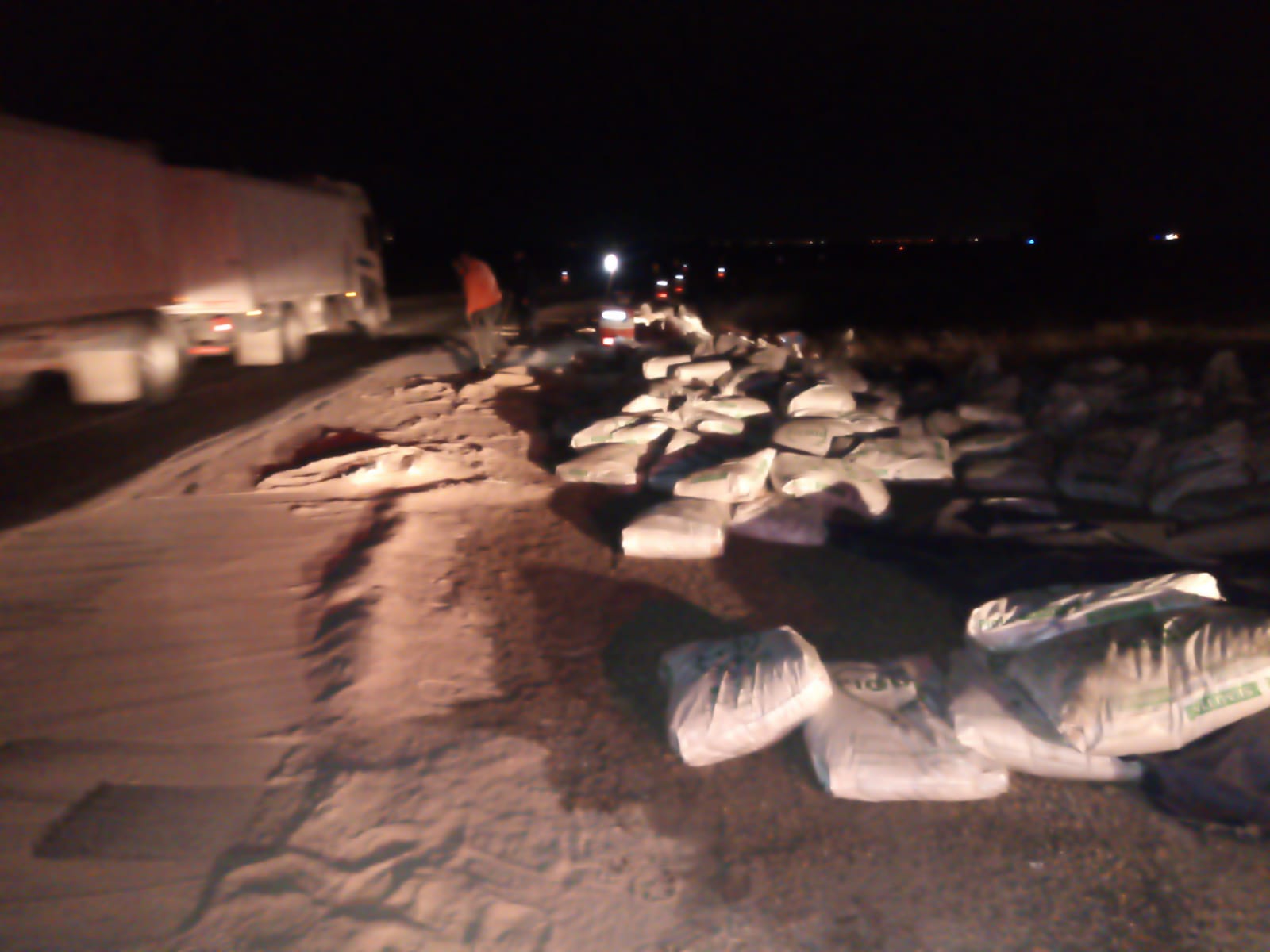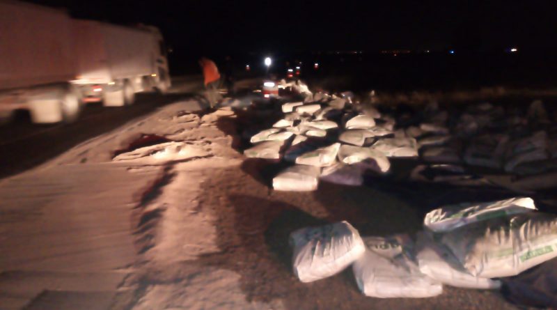 La carga (un suplemento alimenticio animal que se encontraba envasado en bolsas) quedó obstruyendo media calzada, la cual fue liberada después de una hora de trabajo de los servicios de emergencias.