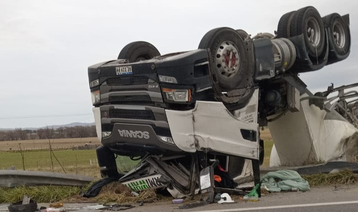 Un camión Scania que transportaba cemento volcó en el kilómetro 638 de la ruta 51, a unos 50 metros del arroyo Pareta, en la conocida curva de Pillahuincó.