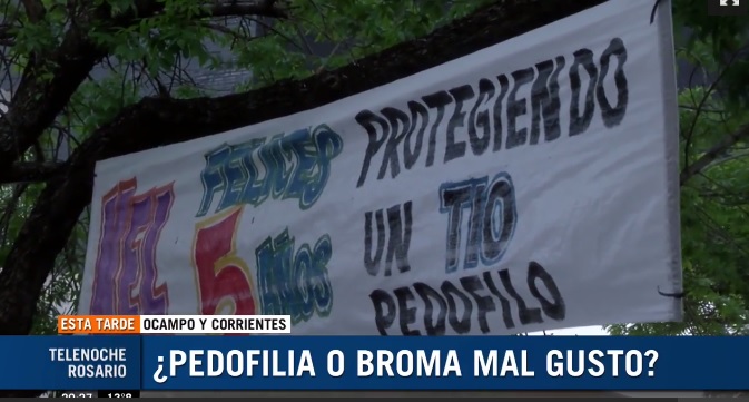 El cartel apareció colgado en calle Ocampo y Corrientes de la ciudad Rosario. Inmediatamente generó confusión entre los vecinos. “Nel, felices 5 años, protegiendo a un tío pedófilo”, dice el mensaje. El informe de Telenoche sobre la reacción del barrio.