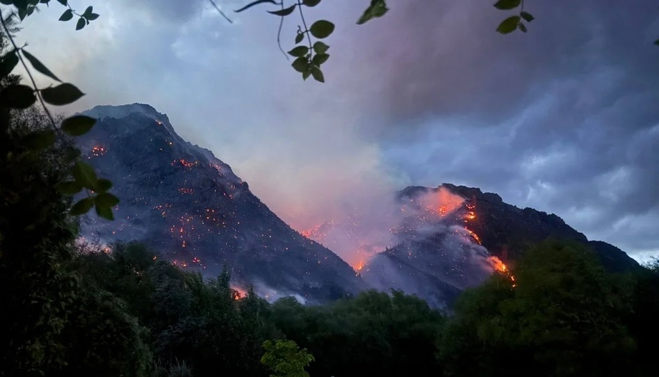 Según el parte oficial emitido a las 23, el incendio continúa activo y ya afectó unas 60 hectáreas de matorral, pastizal, bosque implantado y bosque nativo.