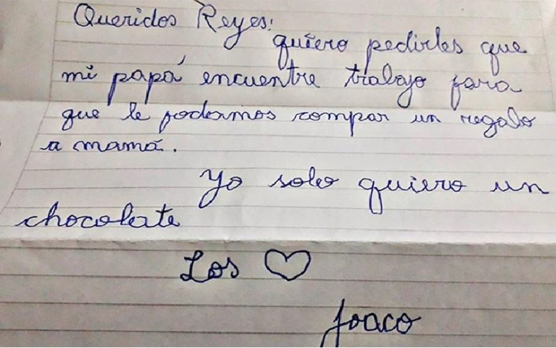 En la ciudad chubutense de Comodoro Rivadavia, Joaco le escribió una carta a los Reyes Magos como venía haciendo todos los años. Sin embargo, no pidió por un regalo convencional, sino que pidió para que su padre consiga empleo y así poder comprarle algo a la madre. Para él solo pidió un chocolate.