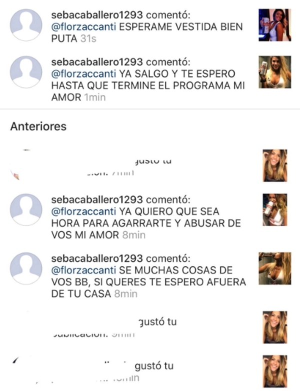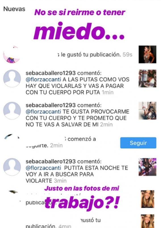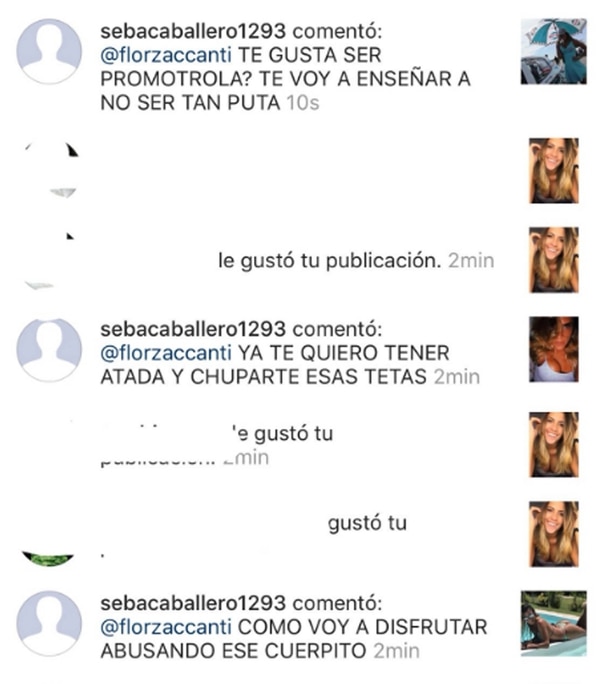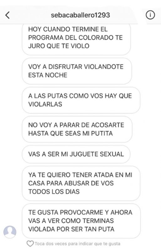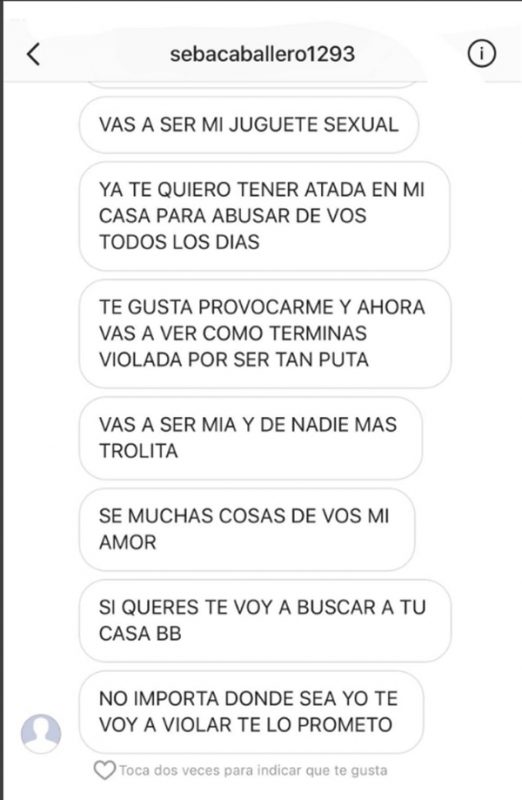 “Esta noche vas a ser mía. Sos una puta, te gusta provocar con tu cuerpo y hoy te violo. Voy a disfrutar violándote esta noche. A las putas como vos hay que violarlas, no voy a parar de acosarte hasta que seas mi putita. Ya te quiero tener atada en mi casa para abusar de vos todos los días. Te gusta provocarme y ahora vas a ver cómo terminás violada por ser tan putita. No importa dónde sea, te voy a violar. Te lo prometo”, decía el mensaje que Flor recibió en Instagram.