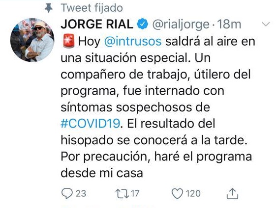 Se viven momentos de mucha preocupación en América, especialmente en el grupo que conforman los integrantes de Intrusos. Jorge Rial anunció en su cuenta de Instagram: “Hoy Intrusos saldrá al aire en una situación especial. Un compañero de trabajo, utilero del programa, fue internado con síntomas sospechosos de COVID-19. El resultado del hisopado se conocerá a la tarde. Por precaución, haré el programa desde mi casa“.