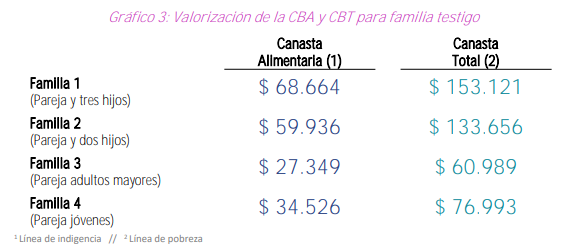 Por su parte, la Canasta Básica Total (CBT) para la misma familia alcanzó los $ 133.656, que son necesarios para cubrir sus consumos básicos, tanto alimentarios como no alimentarios, y así superar el umbral de pobreza.