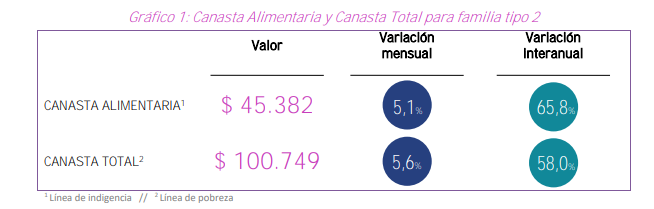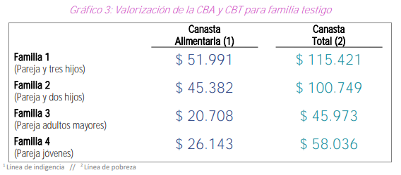 Por su parte, la Canasta Básica Total (CBT) para la misma familia alcanzó los $ 100.749, que son necesarios para cubrir sus consumos básicos, tanto alimentarios como no alimentarios, y así superar el umbral de pobreza.