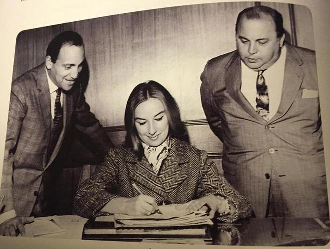 Mirtha firma el contrato para el primer año de su programa en Canal 9, en 1968, ante la mirada atenta de Alejandro Romay y Samuel Yankelevich