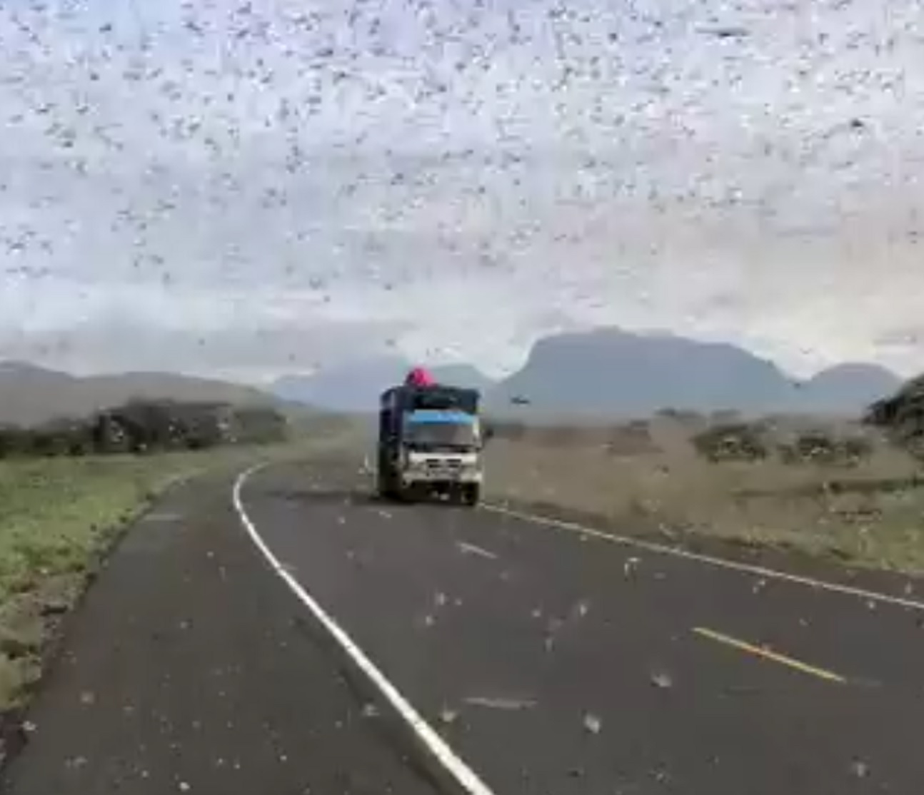 Un video tomado el pasado 24 de abril advierte sobre la situación en África. Lejos de parecer controlada, la plaga registrada en la grabación resulta descontrolada y por momentos impide ver el cielo. El encargado de capturar las imágenes fue el corresponsal de The Washington Post en Kenia, Max Bearak. En el video, realizado en cercanías a la montaña Ololokwe, se ve cómo un camión avanza por la ruta en medio del caótico vuelo de millones de langostas.