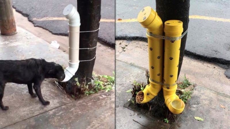 Una mujer publicó en su cuenta de Twitter una foto con un original invento para ayudar a perros de la calle en la vía pública. Se trata de un dispositivo con tubos y precintos atados a un árbol donde las personas pueden depositar agua y comida.