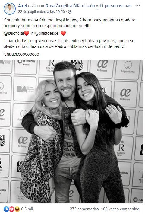 Horas después de que lo señalaran como un acosador por lo que pasó con Stoessel, el cantante publicó una foto abrazado a ella y a Lali, y la acompañó con un refrán: “Con esta hermosa foto me despido por hoy. Dos hermosas personas que adoro, admiro y respeto profundamente. Y para todxs lxs que ven cosas inexistentes y hablan pavadas, nunca se olviden de que lo que Juan dice de Pedro habla más de Juan que de Pedro…“.
