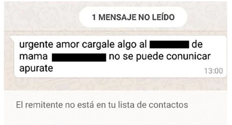 “Urgente, amor”. Así arranca un mensaje que comenzó a viralizarse por WhatsApp, donde se le pide a quien lo reciba que cargue crédito a un determinado número porque “mamá no se puede comunicar”. Y se concluye con un contundente: “apurate”.