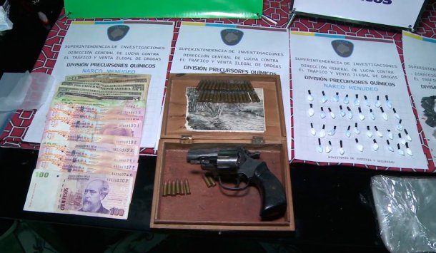 El matrimonio fue detenido y al momento del allanamiento, se constató que era un búnker de acopio y comercialización de estupefacientes, hallando 29 dosis de marihuana y 36 de cocaína listas para la venta, cuatro teléfonos celulares, un revólver calibre 22 con ocho cartuchos de bala en su interior, una caja conteniendo 31 cartuchos de bala, gran cantidad de dinero en efectivo en moneda nacional y extranjera, un paquete de bolsas de nylon transparentes, una notebook y una tarjeta de memoria de dos gigas con información relevante para la causa.
