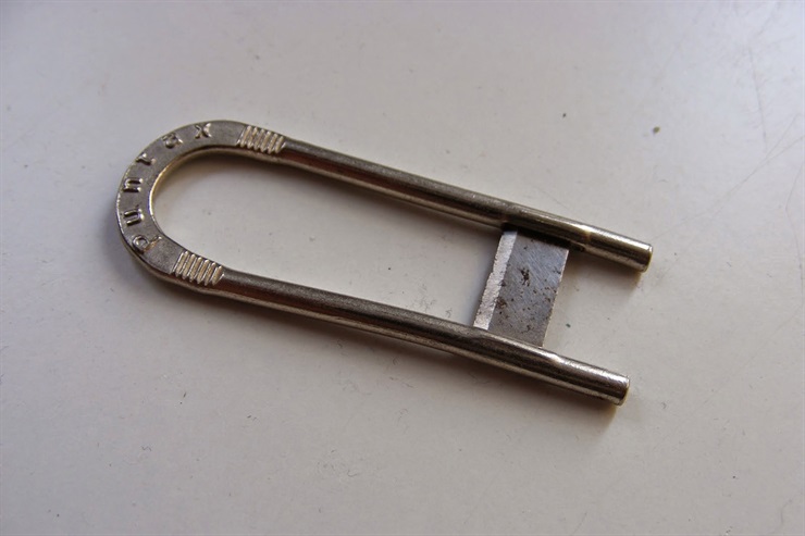 Una herradura con una hoja filosa invertida en un extremo. El sacapuntas más simple de todos. Y, probablemente, también el más incómodo. El exceso de fuerza podía desgarrar más madera de la deseada, romper la mina. Los cortes eran desparejos y, si no era de buena calidad, la hoja perdía el filo muy rápido o directamente se desprendía.