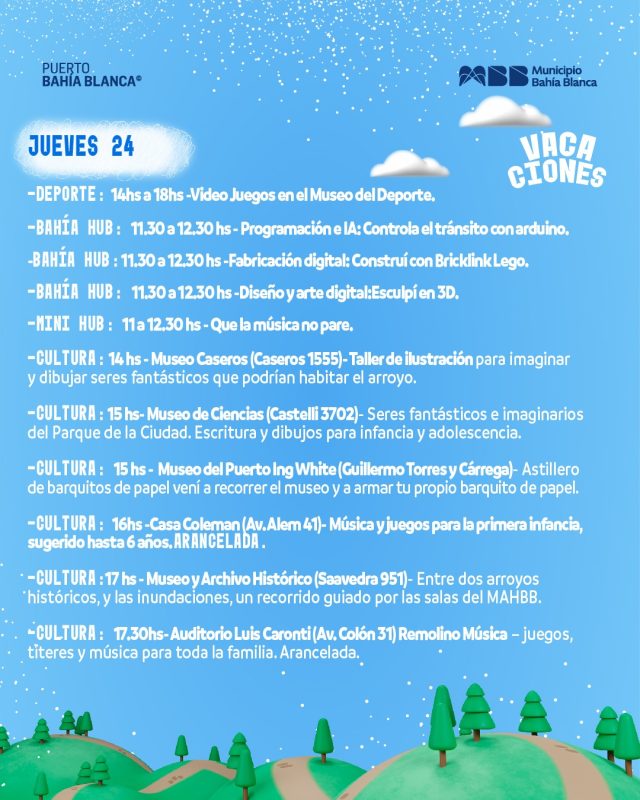 La grilla con cada propuesta libre o gratuita se encuentra disponible en https://www.bahia.gob.ar/vacacionesdeinvierno2025/