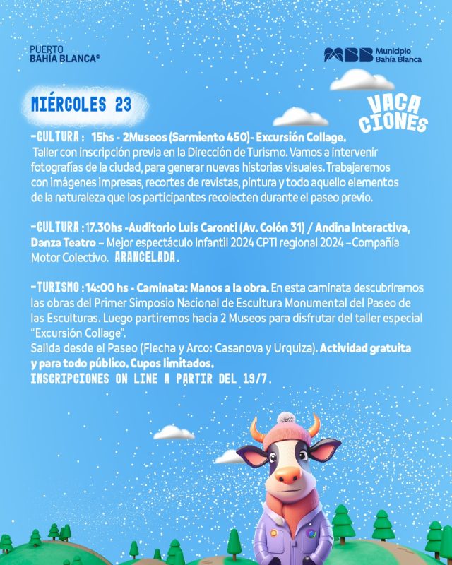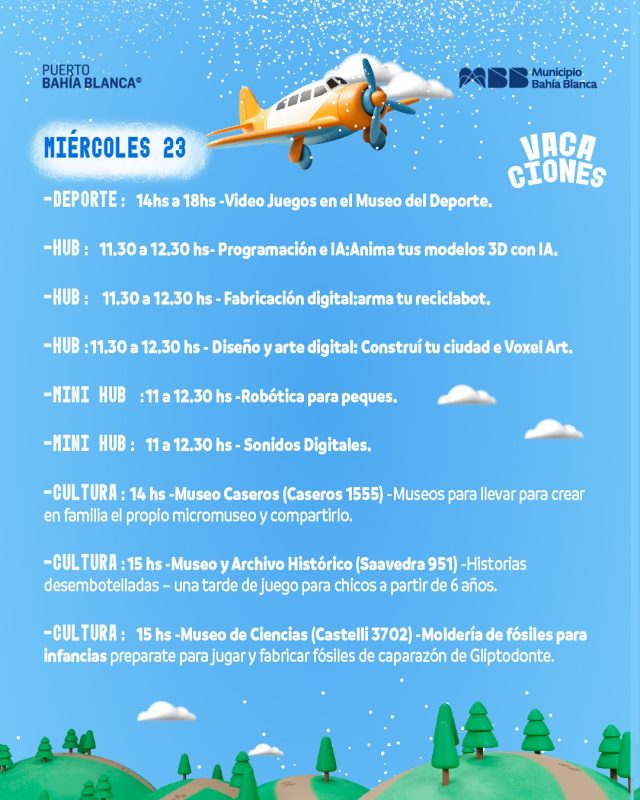 La grilla con cada propuesta libre o gratuita se encuentra disponible en https://www.bahia.gob.ar/vacacionesdeinvierno2025/.