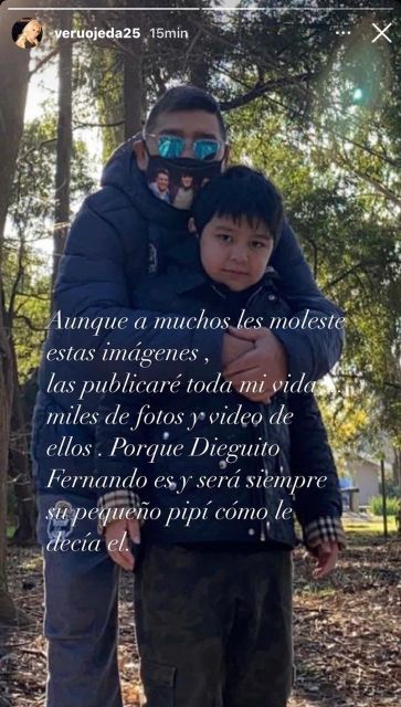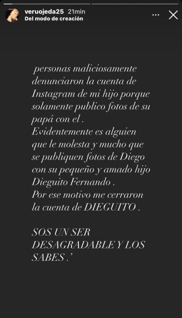 Evidentemente es alguien que le molesta y mucho que se publiquen fotos de Diego con su pequeño y amado hijo Dieguito Fernando. Por ese motivo me cerraron la cuenta de Dieguito“, escribió Ojeda.