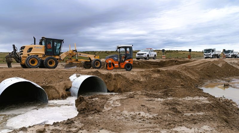 También, se instaló una alcantarilla en la cuneta del acceso al desvío, sentido a Bahía Blanca, donde aún resta aplicar capas de material rocoso para lograr la consolidación definitiva de la calzada, que será esencial para el tránsito de vehículos de gran porte.