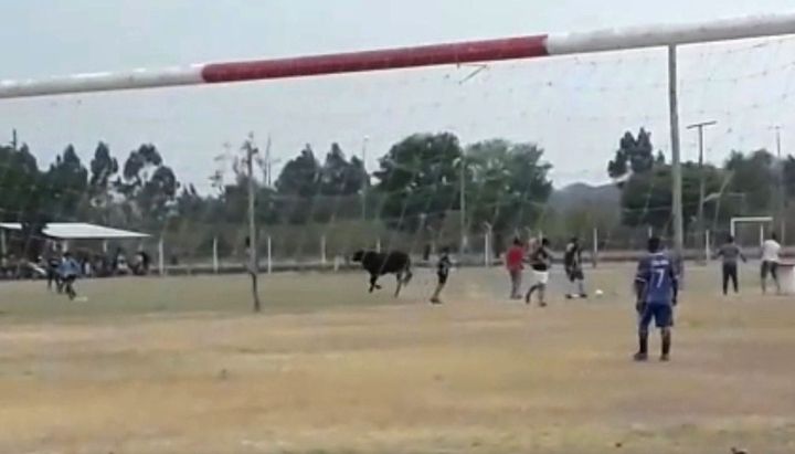 [Video] Un toro invadió una cancha durante un partido de fútbol y golpeó a un espectador en Jujuy