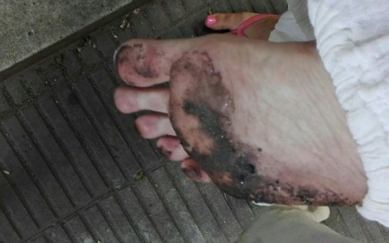 Sucede que el calor derritó la brea que había sido puesta por los trabajadores y le jugó una mala pasada a Victoria, que no sólo se quedó sin ojotas, sino que también mostró cómo la brea se le pegó a la planta de sus pies.