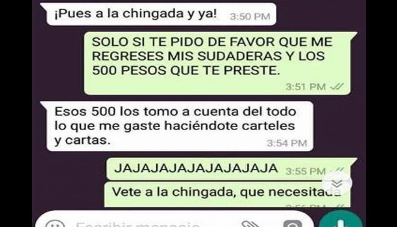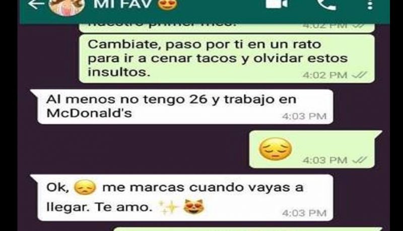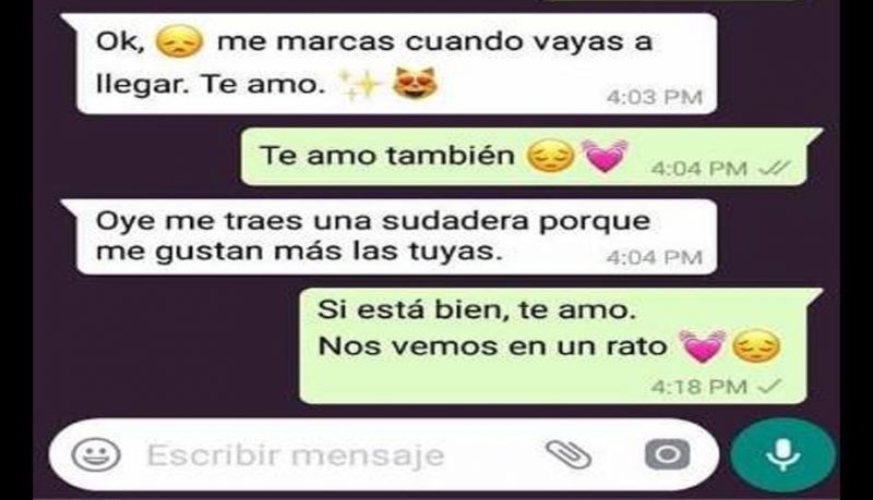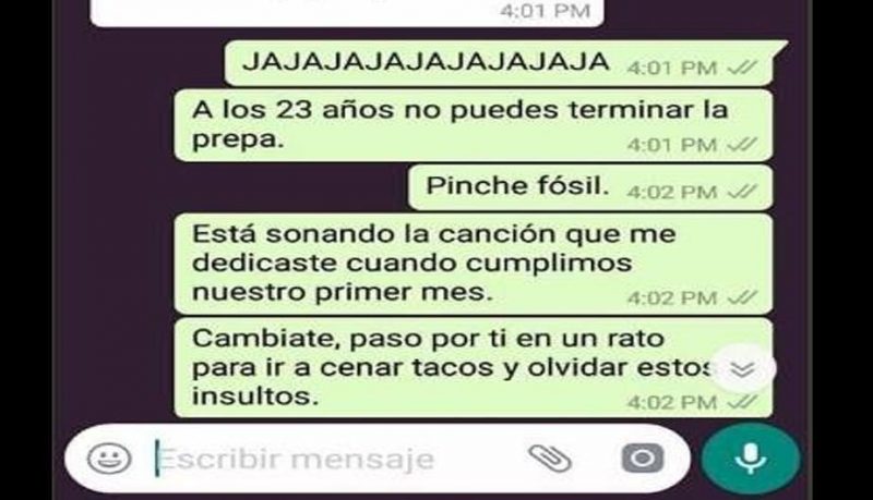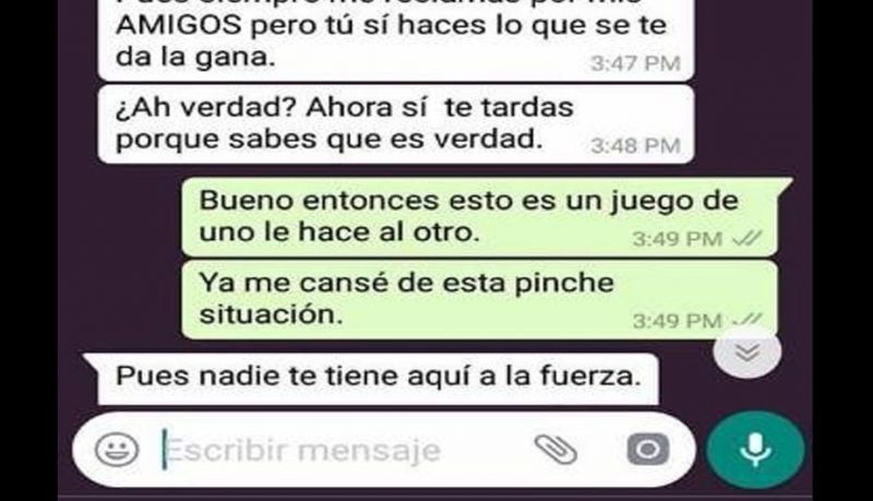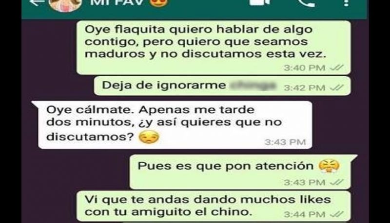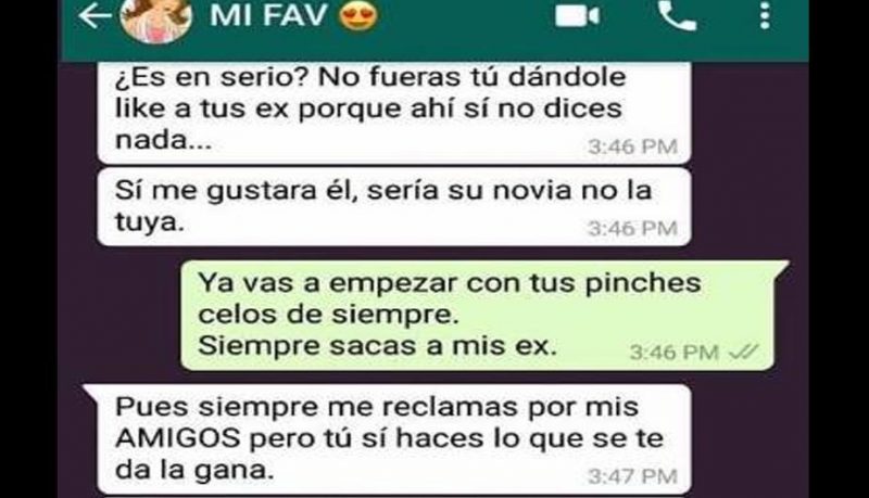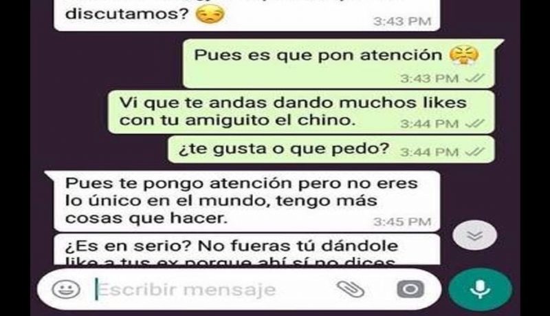 Como podrás observar en la conversación de WhatsApp inicia cuando el joven le reclama a su novia por haber dado “like” a la foto de un amigo en Facebook, la red social de Mark Zuckerberg.