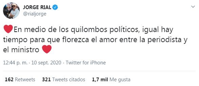 “En medio de los quilombos políticos, igual hay tiempo para que florezca el amor entre la periodista y el ministro”, escribió Rial en su Twitter y luego en su programa agregó información.