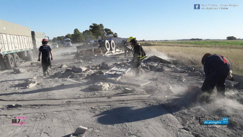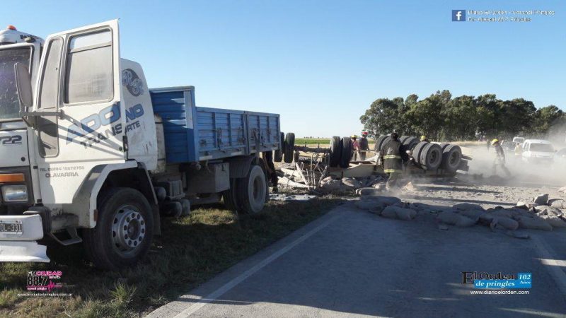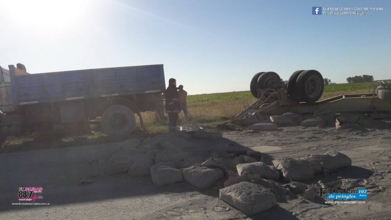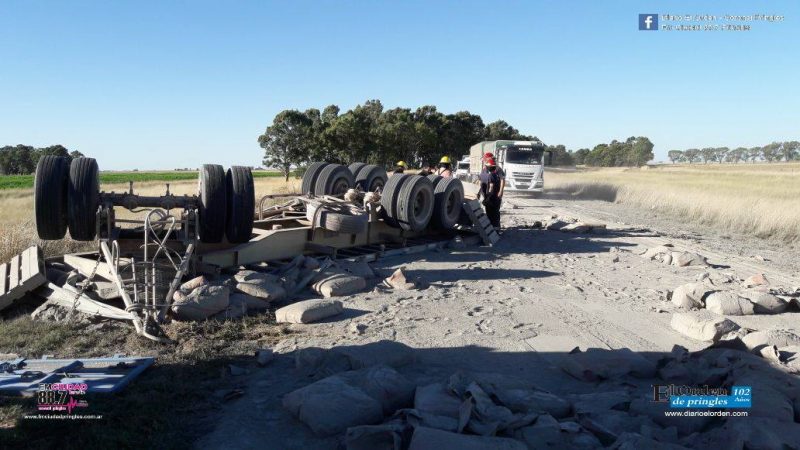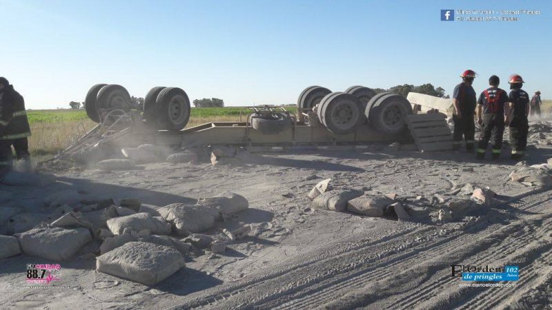 La ruta 51, a unos quince kilómetros de Coronel Pringles, con dirección a Laprida estuvo cortada este miércoles por el vuelco de un camión que transportaba bolsas de cemento.