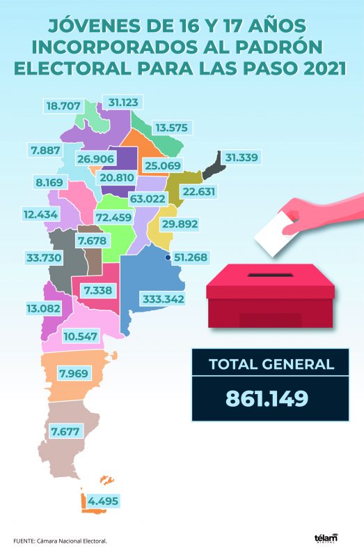 Un total de 861.149 jóvenes de 16 y 17 años, nacidos en 2004 y 2005, se incorporaron al padrón electoral nacional y votarán por primera vez este domingo en las PASO, informó hoy la Cámara Nacional Electoral (CNE).