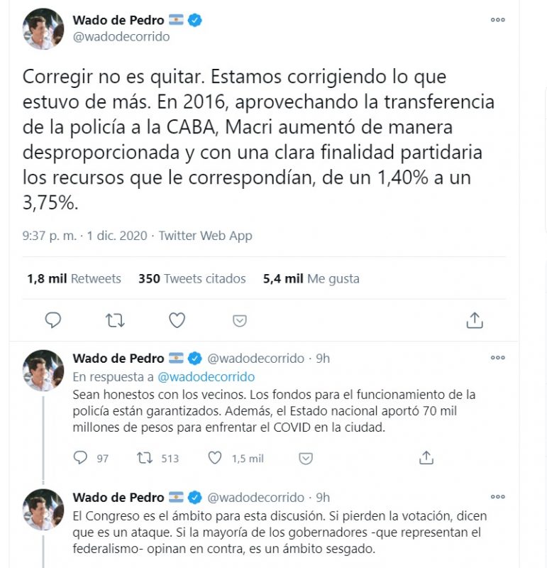 Desde el Gobierno nacional, el ministro de Interior Wado de Pedro salió a responder a través de su cuenta de Twitter. “Corregir no es quitar. Estamos corrigiendo lo que estuvo de más. En 2016, aprovechando la transferencia de la policía a la CABA, Macri aumentó de manera desproporcionada y con una clara finalidad partidaria los recursos que le correspondían, de un 1,40% a un 3,75%”, aseguró.