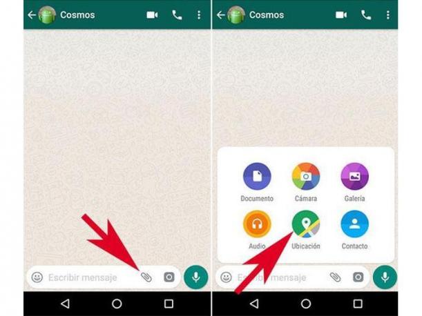 En la ventana de conversación de WhatsApp, la persona que compartirá su ubicación actual debe pulsar el botón “Adjuntar” (el clip) y luego elegir la opción “Ubicación”.