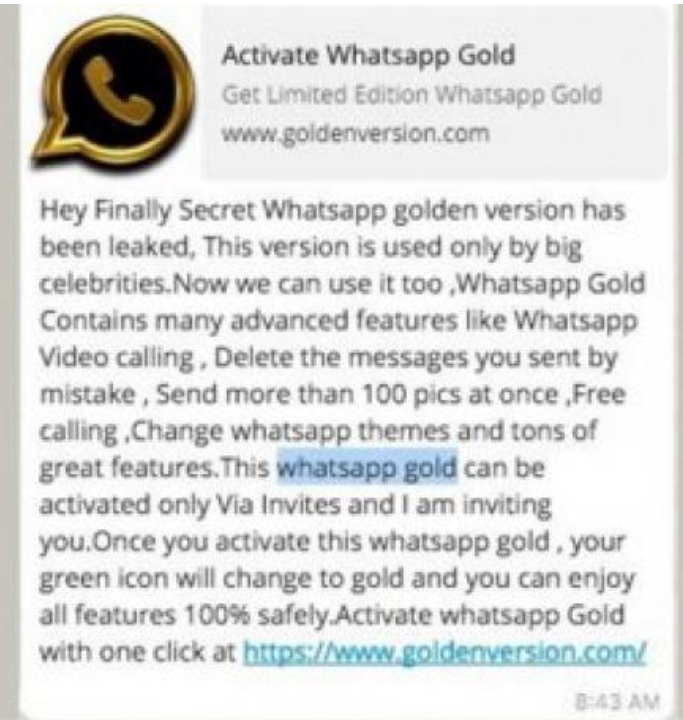 La estafa que comenzó en 2016 volvió a circular este año: se trata de una invitación para descargar una versión “Gold” o “Premium” de WhatsApp, la aplicación de mensajería instantánea, que en realidad se trata de un virus.