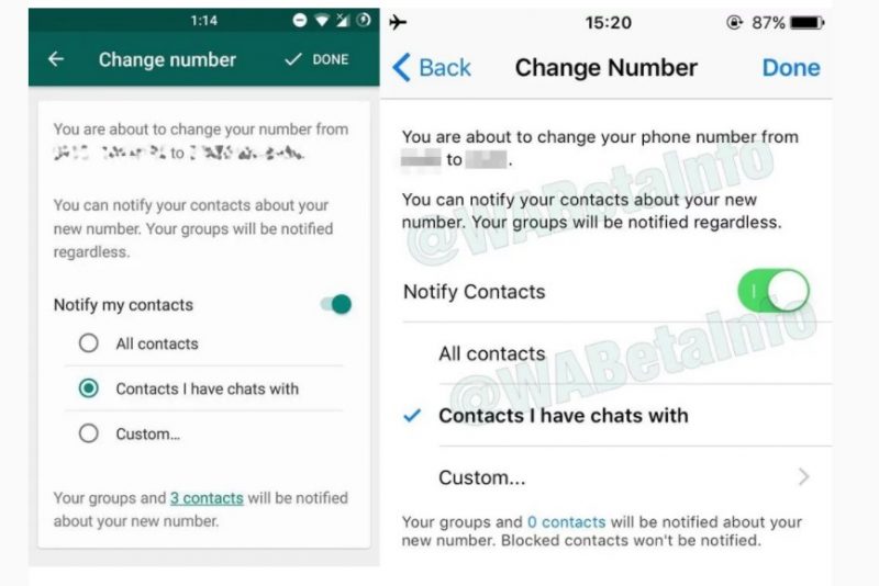 En la versión beta del mensajero, en Ajustes -> Cuenta -> Cambiar número podremos elegir a qué contactos informarle sobre el cambio: todos los contactos, contactos con los que tenemos chats o “customizado”.