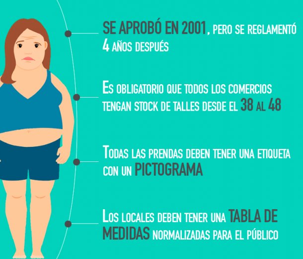 Esa ley, de la que los fabricantes se hacen los distraídos, exige que todas las marcas tengan seis talles: 38-40-42-44-46-48. Estos números tienen que ser acompañados de una etiqueta de cartón con las medidas correspondientes a cada uno.