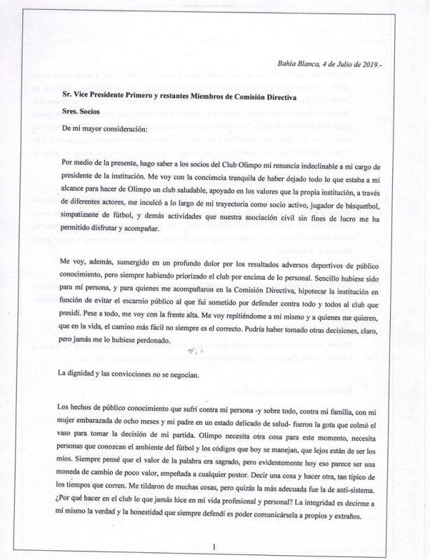Su gestión al frente del “Aurinegro” duró la mitad del mandato: un año y medio. Así se dirigió al vicepresidente primero, Hernán Albisu, al resto de la Comisión Directiva y a los socios de Olimpo: