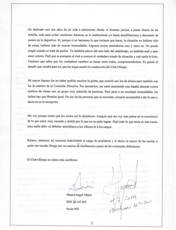 Esta mañana convocó a una nueva conferencia de prensa, pero después se suspendió. Finalmente, mediante un escrito, Mauro Altieri presentó oficialmente su renuncia al cargo de presidente del Club Olimpo.
