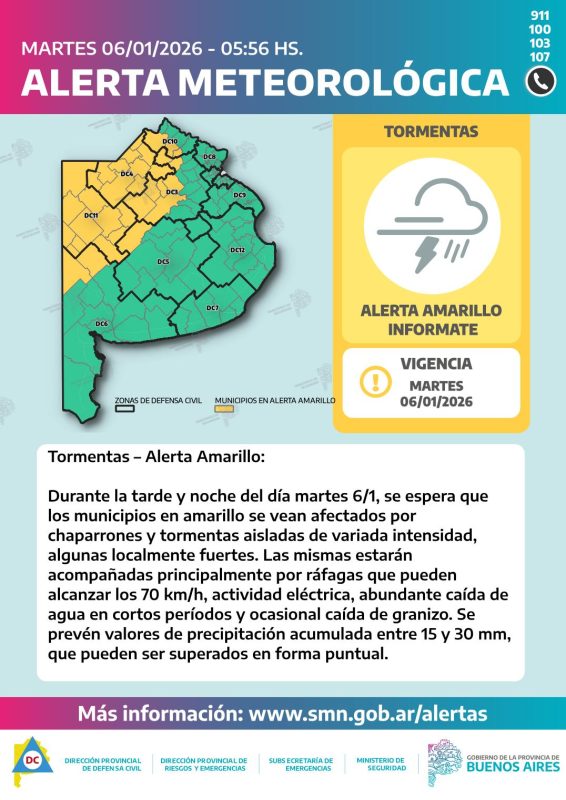 Se esperan lluvias y tormentas a partir de últimas horas de la tarde, entre las 18 a 20 aproximadamente, y de la noche con acumulados entre 10 y 15 milímetros.