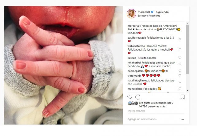El bebé pesó 2,930 kilos y nació por cesárea programada a las 8.54 hs. en el Sanatorio Finocchieto. More tenía fecha de parto para el próximo 2 de abril pero el parto se adelantó 6 días.