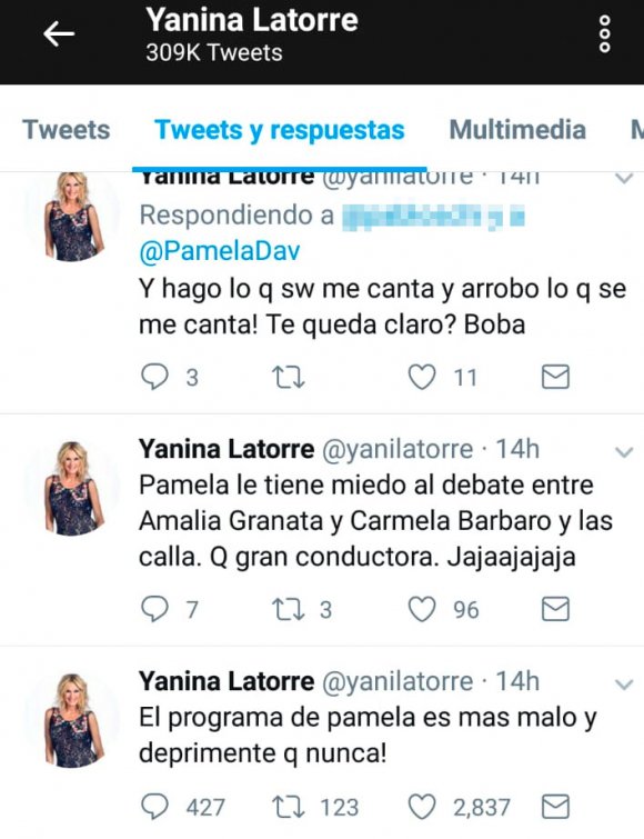 El poco gusto de Yanina Latorre por la labor profesional de Pamela David quedó plasmada, una vez más, en Twitter ante el regreso a la TV de la conductora de Pamela a la tarde, por América.