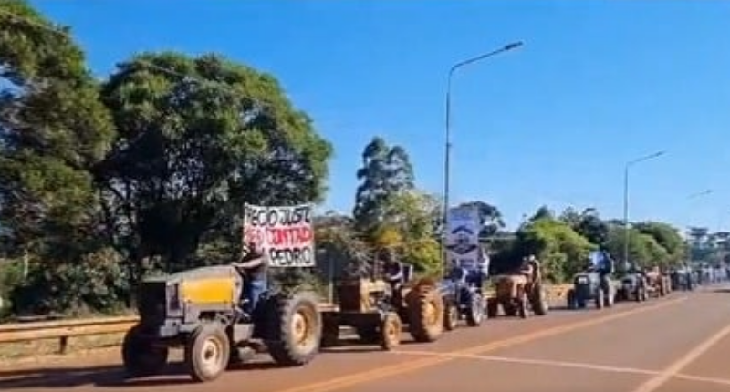 Un centenar de productores yerbateros autoconvocados del norte de Misiones se concentraron hoy a un costado de la Ruta Nacional 14 y luego marcharon con sus tractores por las calles de la localidad de San Pedro en demanda de un precio justo para la materia prima de yerba mate.